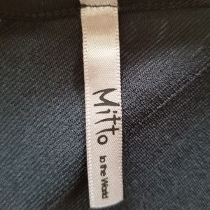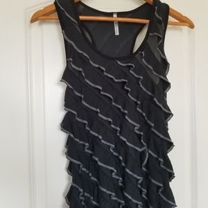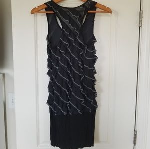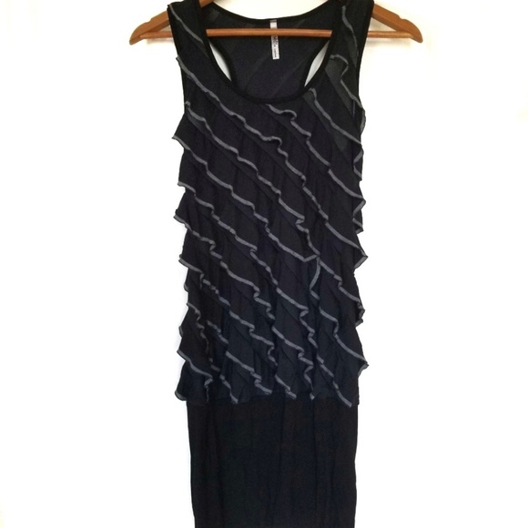 Mitto black dress with black and grey ruffle design and racerback. In great condition and in size L. Please see photos for details and measurements for best fit.