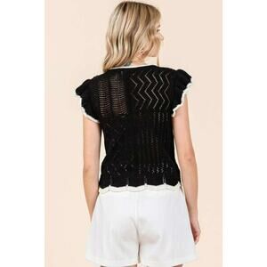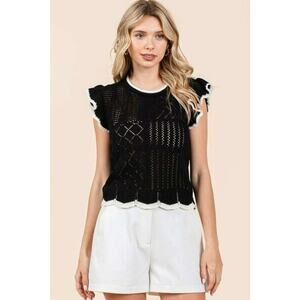 The Openwork Contrast Trim Ruffled Cap Sleeve Knit Top is a charming and feminine piece featuring delicate openwork details and contrasting trims for a stylish touch. The ruffled cap sleeves add a playful and romantic flair to the top, offering a unique and eye-catching design. Made from knit fabric, this top is comfortable to wear and perfect for adding a touch of elegance to your outfit.