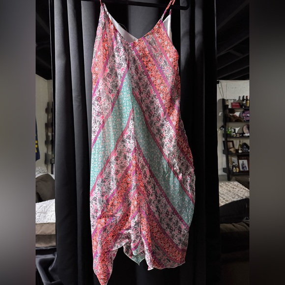 Chic sleeveless dress with floral and geometric patterns. Features white, aqua, orange and pink hues.