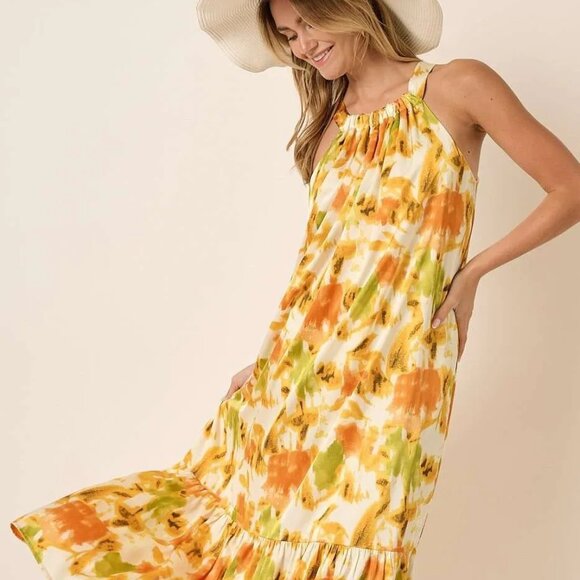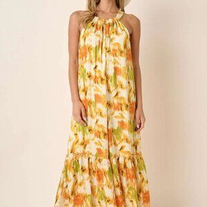 Mittoshop Watercolor Print Halter Neck Satin Maxi Dress