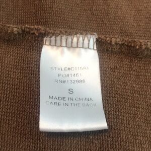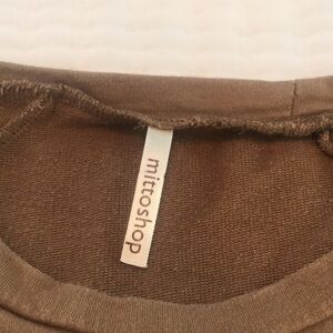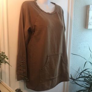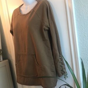 Mittoshop caramel colored sweatshirt, soft and cozy, 100% cotton, long sleeves with beautiful tie detail down the arm, kangaroo pocket in front, round neckline, cut off hemline, in great condition.
