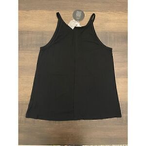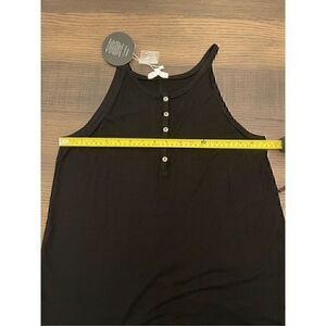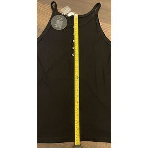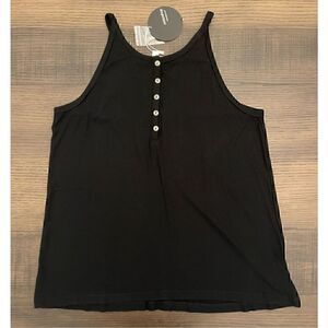Size Small Black Mittoshop Tank Top featuring soft lightweight flowy material, a high rounded neckline, thin shoulder straps, 5 functional buttons, and a relaxed silhouette that falls into an uneven hemline!