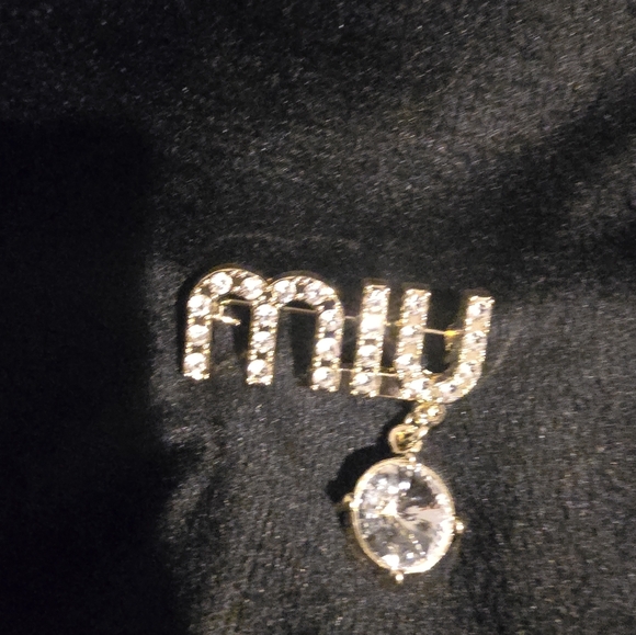 Stunning Miu Miu 18kgp brooch with a gold finish and sparkling crystal drop. Adds elegance to any attire.