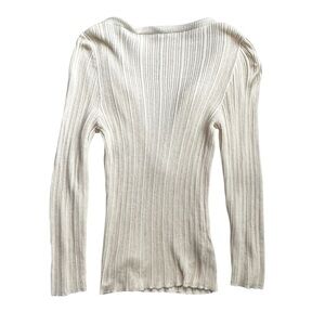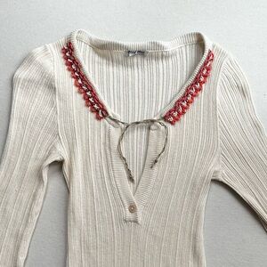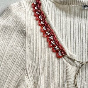 Y2K Miu Miu beige ribbed long sleeve sweater with ornate orange & white beaded neckline with drawstring twine. 100% cotton