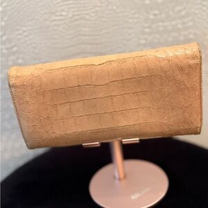 Chic Miu Miu camel colored crocodile-embossed leather long continental wallet with gold-tone hardware. Features multiple compartments for cards, coin zipper, cash. Snap closure. Perfect for stylish outings. Elegant and versatile. Good condition. Light signs of wear consistent with age.