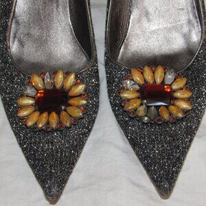 Vintage Authentic Miu Miu Black Silver Glitter Flower Stone Pointed Toe Witch Goth Heels 39 1/2