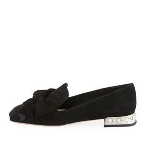 Stunning black suede loafers with bow detailing and jeweled detailing on heel. Elegant, classy, and very fun. Wear this everywhere and dress them up or down