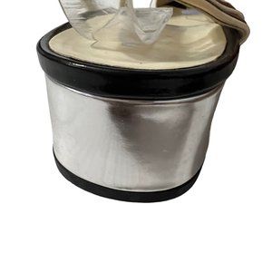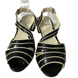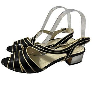 Elegant black and white heeled sandals. Strappy design with a chic block heel. Perfect for any occasion.
