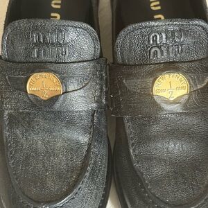 Miu Miu Black vintage Leather womens Loafers 2025 runway shoes