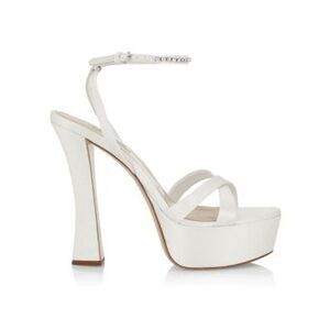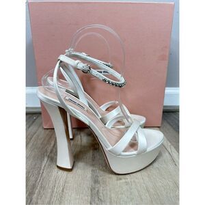 Miu Miu's lustrous satin sandals are fastened by a dainty ankle strap adorned with dazzling crystals. Anchored by a platformed flared heel, this pair is topped with a crisscrossed vamp.