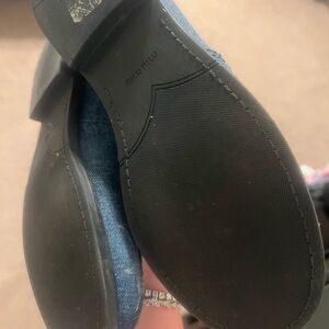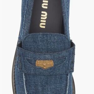 Crafted from a denim-like fabric, these Miu Miu flats showcase a rich blue color that exudes casual elegance. The loafer-style design features a prominent strap with a gold accent, adding a touch of sophistication. With a flat sole and detailed stitching, these shoes offer both comfort and style for everyday wear.