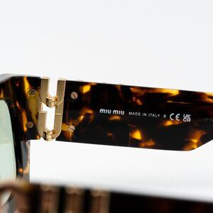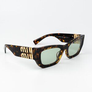 These Miu Miu sunglasses feature a stylish tortoiseshell frame in brown tones, complemented by gold accents on the temples. The rectangular shape offers a modern twist on a classic design, making them a standout accessory.