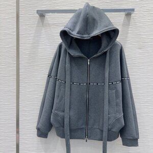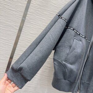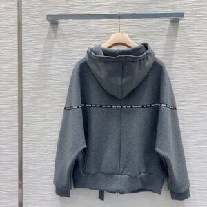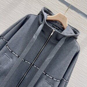 Stylish charcoal gray sweatshirt by Miu Miu. Features a hood and front zipper. Comfortable and trendy