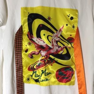 This multi-coloured Miu Miu 'Miu Miu Club' print t-shirt is out of this world. Inspired by '90s rave culture and fabricated in Italy, this tee features a round neckline, short sleeves and a multi-coloured 'Miu Miu Club' print at the front complete two side slits and multiple orange and black gingham ties at the waistline.