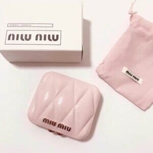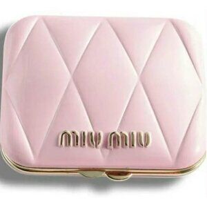 Miu Miu compact double mirror in pretty pink with gold lettering and trim.