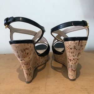 Miu Miu Black Patent leather open toe sandal with criss-cross bands at vamp, adjustable slingback ankle strap and cork wedge.