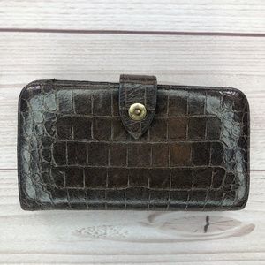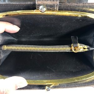 Snap button closure, 8 credit card slots, 1 large pocket and a coin compartment. Edges are all intact with minor scuffing at corners. Please look at photos.No dust bag or box.