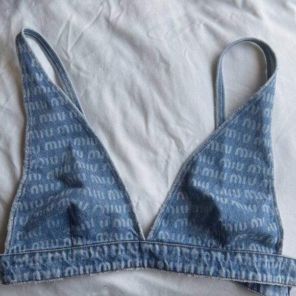 monogram Miu Miu denim bra top. Size hook-eye closure. Size is listed as 42 by brand, total bust measurement is 33.5". Only worn a handful of times
