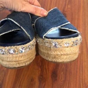 A few stones missing and On the jute center of both shoes there is a darkening orange from the glue may be able to be fixed. Otherwise in good condition normal signs of wear.