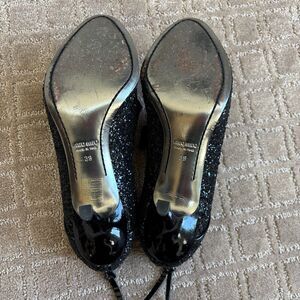 Oxfords are very on-trend right now, especially a pair as hot as these! They’re sleek black leather covered in rich glitter with a back zip, peep toe, sexy cutouts, and a wide grosgrain ribbon tie. The heel measures 3 inches tall, and the insole is padded for comfort.
