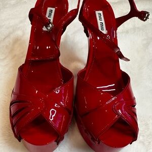 Elegant red patent leather heels. Strappy design with a chic finish. Perfect for elevating any outfit.