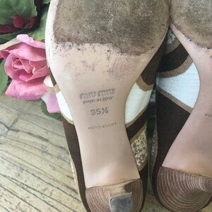 This pointy toed fabric gold, bown, and green high heels from Miu Miu have a stack wood stiletto heel. They marked a size 35 1/2 (size 5 1/2) but really fit a size 6 (which is what I am). The heel is 3 3/4". Note there is light wear on the toe tips (see photo).