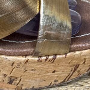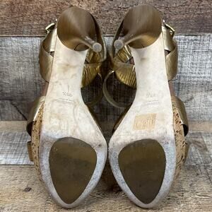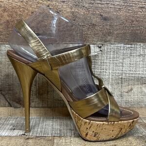 Miu Miu Gold Strappy Stiletto Open Toe Heels Cork Sole Size 39.5 9.5