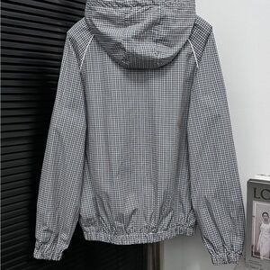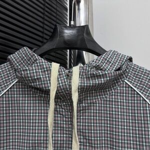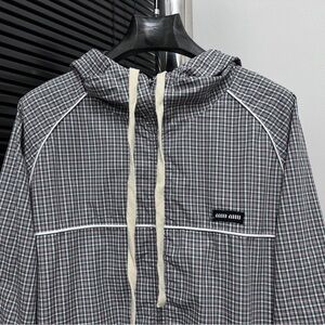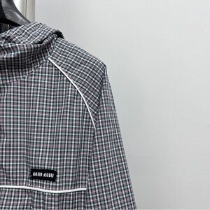 Chic Miu Miu plaid fabric. Features a bold black logo patch. Elegant and modern style.