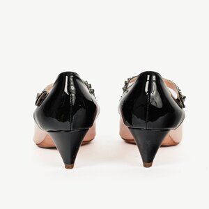 Made in Italy, these mary janes from Miu Miu are crafted with patent leather in light pink and black hues, and feature covered kitten heels, closed pointed toes, studded straps, and leather lining and soles.