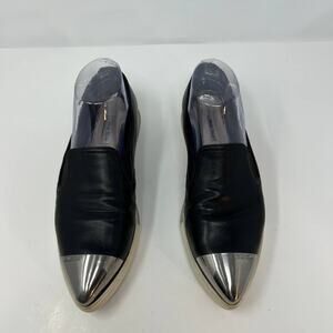 Miu Miu Women's Slip On Loafers. In the colors black, white and silver. Tagged size 38.5 (8.5 US). These women's Miu Miu shoes feature an easy slip on, silver pointed capped toe, embossed logo, flat heel and a non-slip outsole. Style number 5S9010F. Made in Serbia. In preowned condition with minimal signs of wear. One of the silver caps is cracked, see photos for details - shoes priced accordingly.