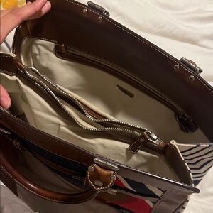 Elegant Miu Miu briefcase with a bold red and brown design. Features premium leather and striking geometric patterns. Ideal for professional use.