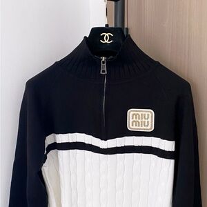 Elegant Miu Miu sweater in black and white. Features a cable knit design with a zip collar and logo patch.