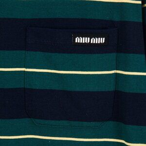 Embrace sophisticated nautical style with this authentic Miu Miu striped long sleeve top in classic navy and green. Brand new and unworn, this 100% authentic piece features the perfect balance of timeless stripes and contemporary luxury. The premium cotton blend offers exceptional comfort while maintaining its shape wear after wear. Whether you're pairing it with tailored trousers for a polished look or your favorite denim for casual weekends, this top adds instant refinement to any outfit. The rich color combination works year-round, making it a versatile foundation piece for the fashion-conscious wardrobe