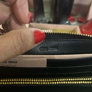 Chic Miu Miu wallet with textured design. Features a sleek black and gray color scheme. Perfect for stylish organization.