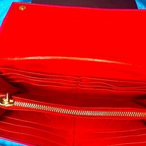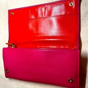 This elegant Miu Miu clutch wallet in a vibrant pink hue is crafted from high-quality leather, featuring a sleek and minimalist design. Double snap closure. Zip coin pouch. The glossy finish and gold-toned logo add a touch of sophistication, making it a perfect accessory for any stylish occasion. She’s a beauty! Preowned condition with small flaws expected with used bags and wallets. She’s been cleaned and leather conditioned with mink oil. She comes in a box and a dust bag.