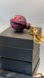 A unique and modern Miu Miu accessory features a playful purple and pink color scheme embellished with distinctive crystal details. A hook clasp and ring makes this a versatile piece that can be attached to keys or handbags.