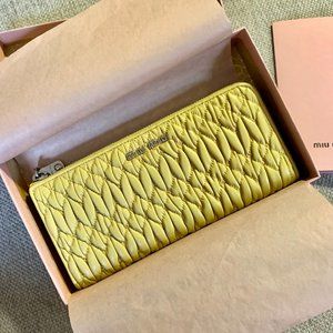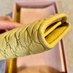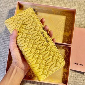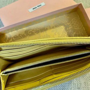 Pre-loved MiuMiu continental wallet with smooth zip-around closure. Beautiful yellow mustard colored leather with unique quilted pattern. Super soft nappa leather and nice to touch. Used lightly. Multi-compartment interior and a secure zip in the middle.