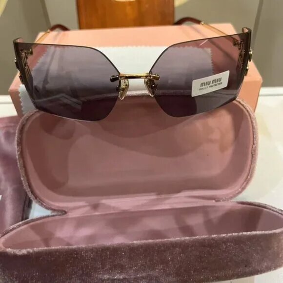 Elegant Miu Miu sunglasses with purple lenses. Gold accents add a touch of luxury. Perfect for stylish outings.