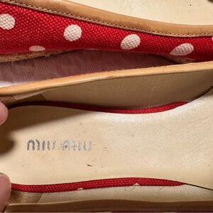 Miu Miu red canvas polka dot flats with natural bow. Size 38.5