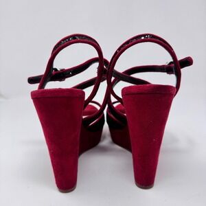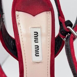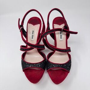 Miu Miu Red Suede & Black Glitter Strappy Wedge Sandals Size 38.5