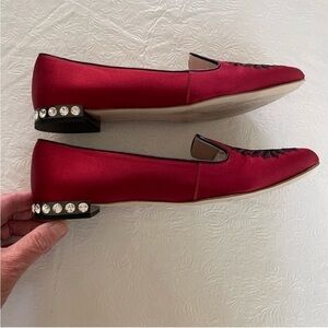 Miu Miu Satin Crystal Embellished Smoking Loafer. Size 39. These eye-catching slip-on shoes by Miu Miu are red satin with black embroidered crest motif and heels that are embellished with crystal studs. Insoles are leather lined. Outer sole is leather.