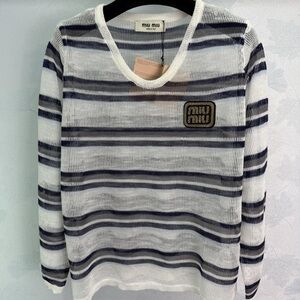 Miu Miu striped sweater in black, gray, and white. Features a V-neck design.