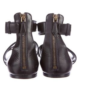 Black soft leather gladiator Miu Miu sandals with gold-tone stud embellishments throughout, tonal stitching, stacked heels, buckle closures at ankles and zip closures at back counters.