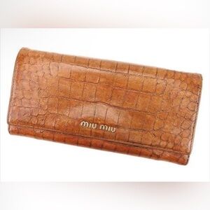 Stylish Miu Miu wallet with croc-embossed texture. Features a tan hue.