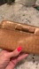 Elegant and clean Miu Miu wallet. Croc-embossed texture. It’s hard to see in pictures, it may look dirty, but it’s gold-tones in the tan leather. Very light corner wear. Sleek zip closure. It has gold all throughout the tan color. Inside is clean. Only a little coin residue in the coin pocket. Stylish and functional.