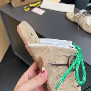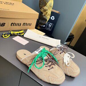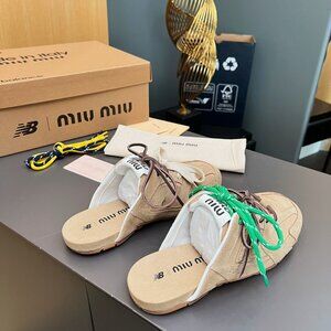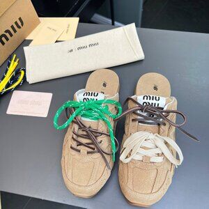 Elegant tan slippers by Miu Miu. Features green and brown laces. Perfect for casual outings.