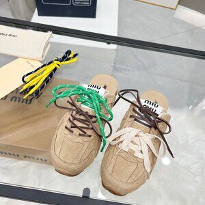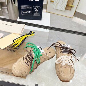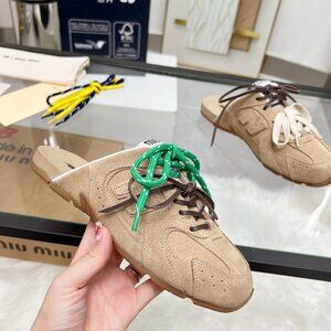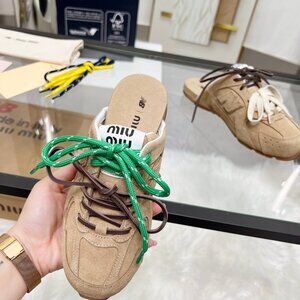 Miu Miu Tan Suede Slippers with Green and Brown Laces