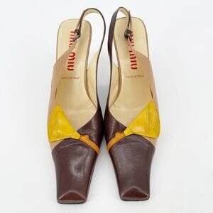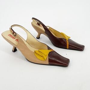 Miu Miu Vintage Tan Brown Yellow Flower Detail Square Toe Slingback Heel