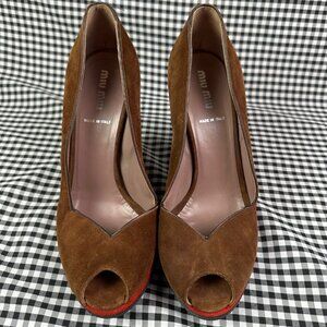 Miu Miu Vintage Y2K Suede Brown Rainbow Wedge Peep Toe Heel EU 38.5 / US 8.5
