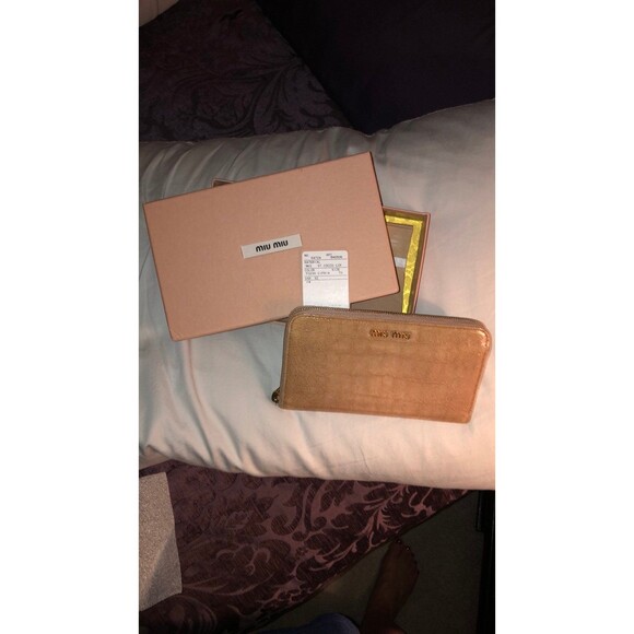 Good used condition beige vintage Miu Miu Zip around wallet with box and information card. Slight storage smell. Please review pics as they are part of the description. Bid responsibly as all bids are binding.
